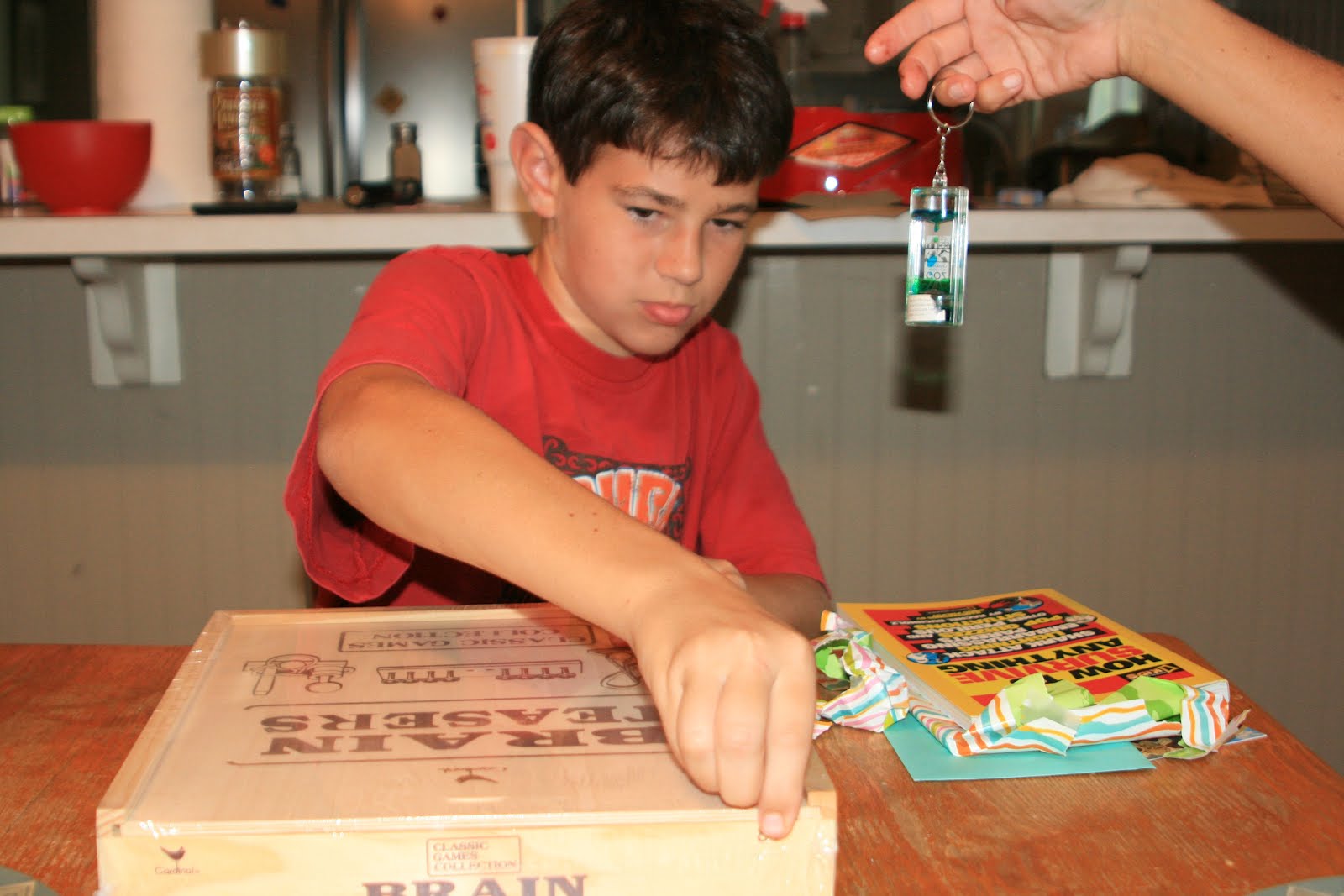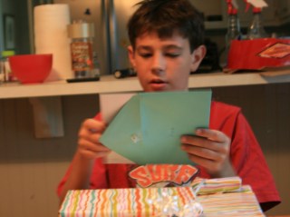 Since Rod will be in Atlanta this week, we decided to open one of Alex’s birthday presents early. Uncle Les and Aunt Laurie sent their presents early so we already had them. Lis fixed Tacos for the boys tonight, one of their favorites and then we opened the presents. Alex now understands the meaning of brain teasers… 🙂