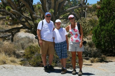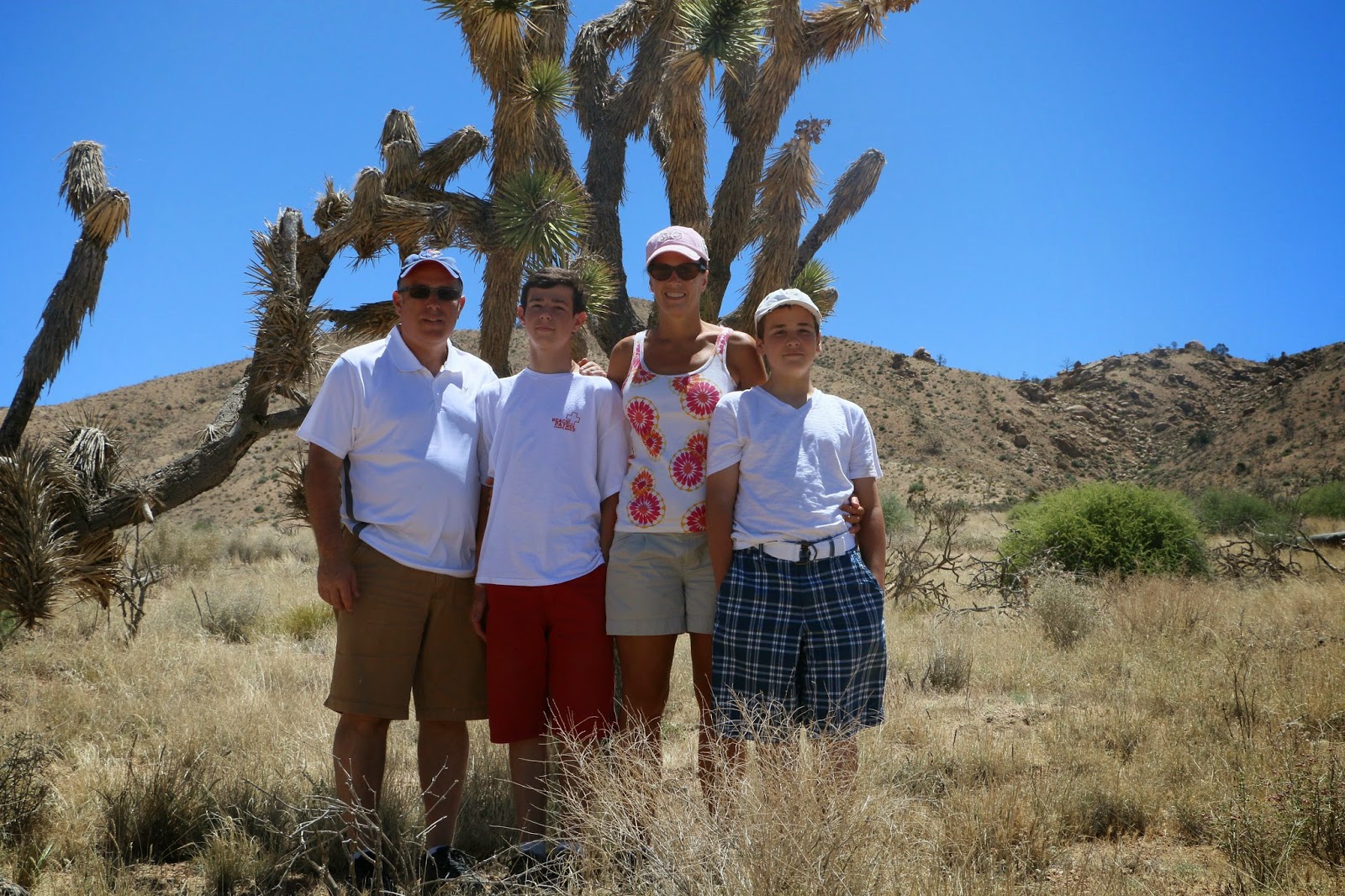 Yes, believe it or not we drove down to the Mojave National Preserve and went on another hike. After today, we think the boys may have had enough of hiking though. Today’s trip was cut a little short because nobody seemed to have strength to go on any farther except for Mom. The trip took about 2 1/2 hours one way and the boys slept on the way down while Mom got a small cat nap on the way back. The Mojave National Preserve actually has more sand dunes than the Mojave desert and more Joshua trees than the Joshua Tree Forest. The only problem is that they also have no roads or at least what we would consider roads. The areas that were paved were quite rough and then we ended up on some dirt roads (primitive roads) that were so bumpy they actually knocked off the rear view mirror. Needless to say there weren’t a whole lot of other people out there with us, except for the group of people competing in a bicycle race… they appeared to all leave after the race. We never made it to “hole in the wall” or the sand dunes because of the rough roads but we did get a short hike in as we were leaving – the entire trail would have led to an abandoned mine had we completed the entire 3 miles. Other than that we did wander around some other parts of the desert, but it seems that once you have seen one part of the desert you have pretty much seen it all. Overall we all had another fun day but we think everyone is ready to come home.