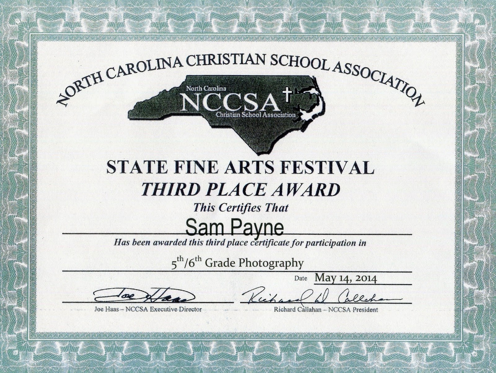 Sam took third place in the NC Christian School Association’s Fine Arts Festival. Sam competed against all 5th and 6th grade students in NC Christians schools and came away with a 3rd Place finish for his horse photo. We are very proud of him and can’t wait to see what he takes photos of during our upcoming vacation. 🙂