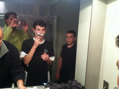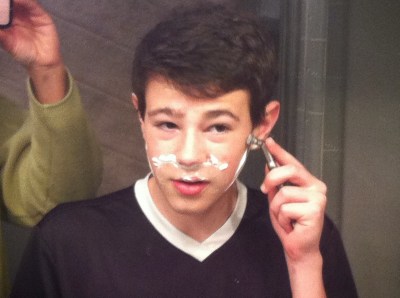 Well Ok there wasn’t really a haircut but Alex did get his first shave back on March 16th. We posted the photo to Facebook but just realized that we never posted it on the blog. So here are a couple of shots. Alex will definitely have to shave again before he goes back to school next week. He also probably needs a haircut – very long and curly right now. 🙂