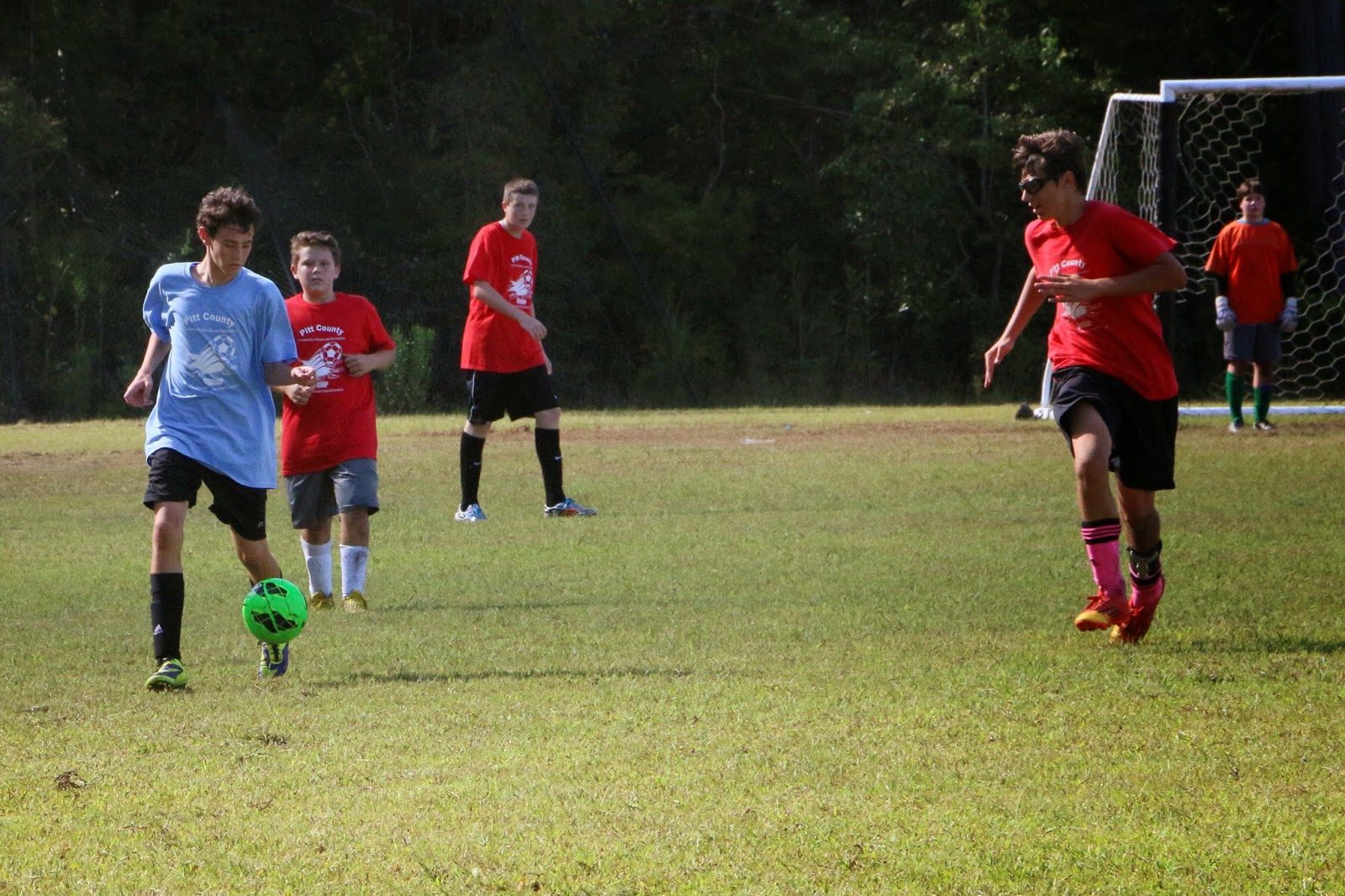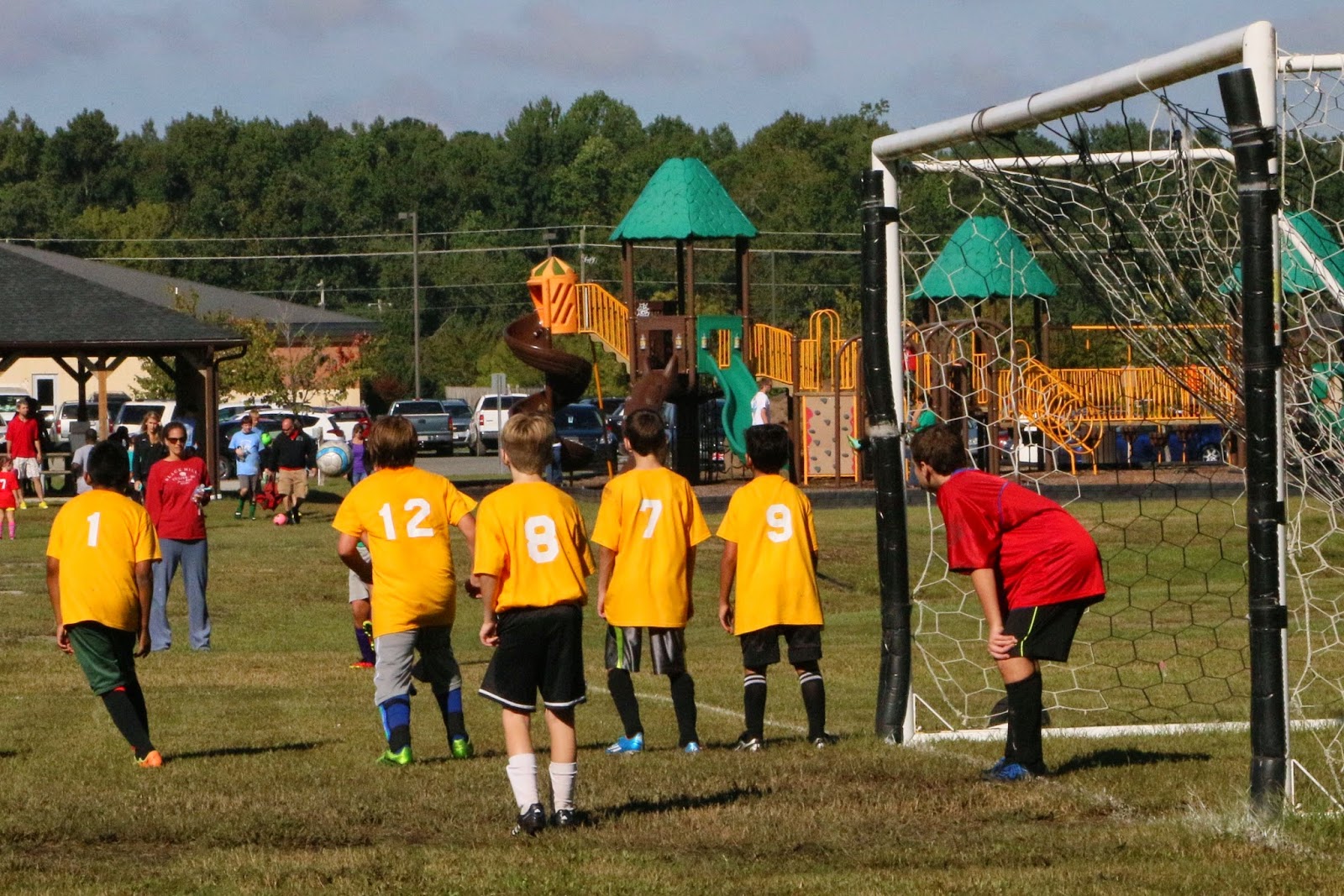 First games of the Fall Recreation League soccer today and Alex had two games while Sam just had the 1 game. Alex lost the first game 3-1 but won the second by a landslide as Alex had 3 goals and Matt had 2 goals. Not only that, but he played Zac and Jeremy’s team. They were missing a couple of players and had a stand-in goalie which didn’t help their cause any. Zac did school Alex on several plays and then one of the girls schooled Alex as well. Alex’s defense was that she played high school ball at Connely… the rest of the boys weren’t buying that though. Alex also got tackled by one of the bigger girls on the other team. 🙂