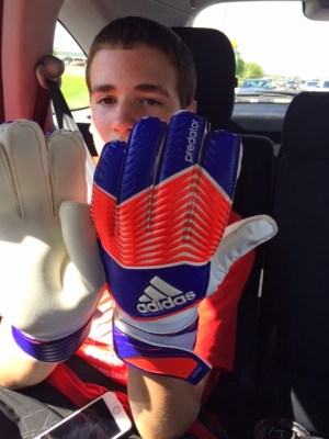 Sam meanwhile was put in at goalie/keeper! We originally thought it was only going to be for just this game because the regular goalie wasn’t there, but found out after the game that the ‘regular’ goalie was there but they needed him on offense. So it looks like Sam will be playing goalie all year. The coach volunteered to give him some one on one time on Wednesday nights after the regular practice (Sam will generally miss practice because it is from 5pm – 6pm), so he needs to make the most of the coach’s offer. Sam actually played pretty well for his first whole game as keeper. He did give up 3 goals but one of them he couldn’t see and another one was just a great shot. He made a couple of nice stops too, just needs to learn when to fall on the ball and when to make a challenge. So all in all it should be a good season! Below are some photos from the two games, a photo of Sam with his new goalie gloves we picked up later in the day and then a short video of Alex trying to help him learn how to reject the ball at goal…. hmmm – love the gloves but the flip flops just don’t match.