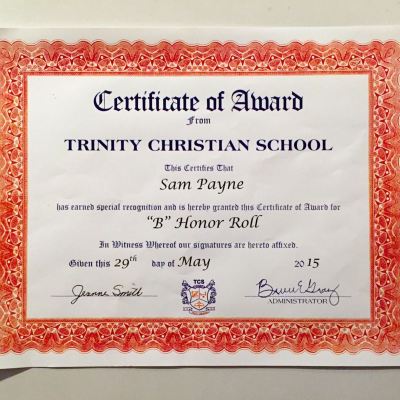 Sam once again pulls down B’ Honor roll for the year. He had some very high B’s (92%-93%) this year that were so close to being an A’ grade…. not to mention he had quite a few A’s too! We are very proud of his academic achievements and are hoping for some more A’s than B’s next year. 🙂