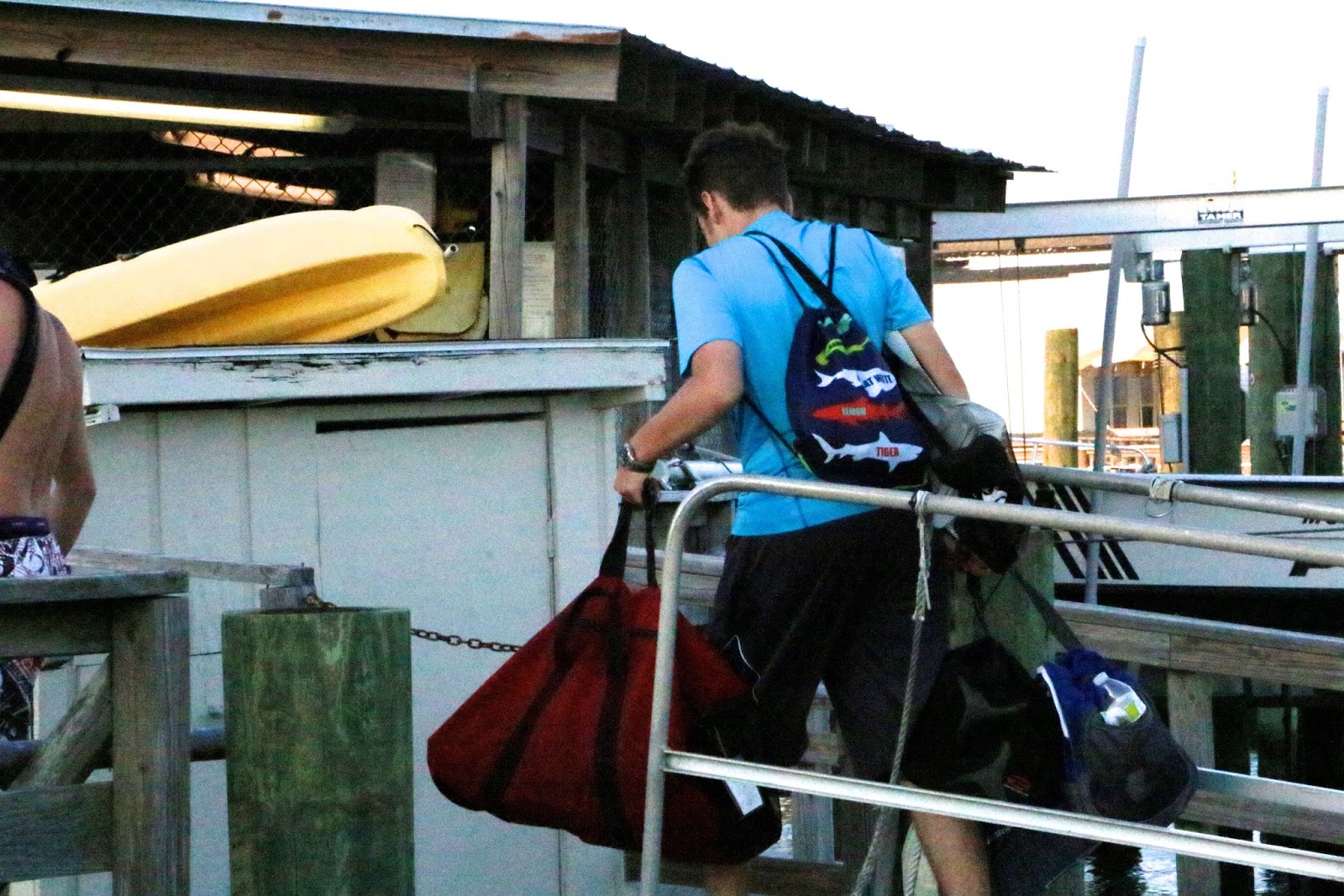 | Sam carrying all his gear off the boat. |