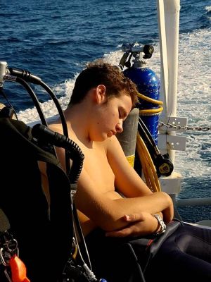| Sam prepping equipment on the boat before departure. |
