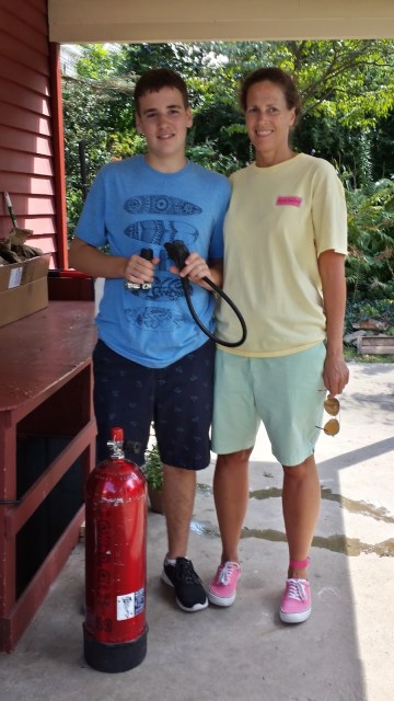 Sam got a tank and regulator from Uncle Deke this last weekend – these will come in quite handy! We took them in today to Rum Runners Dive Shop to have them tested and checked out… we are sure they were upset we wouldn’t be renting nearly as much equipment next time around. 🙂