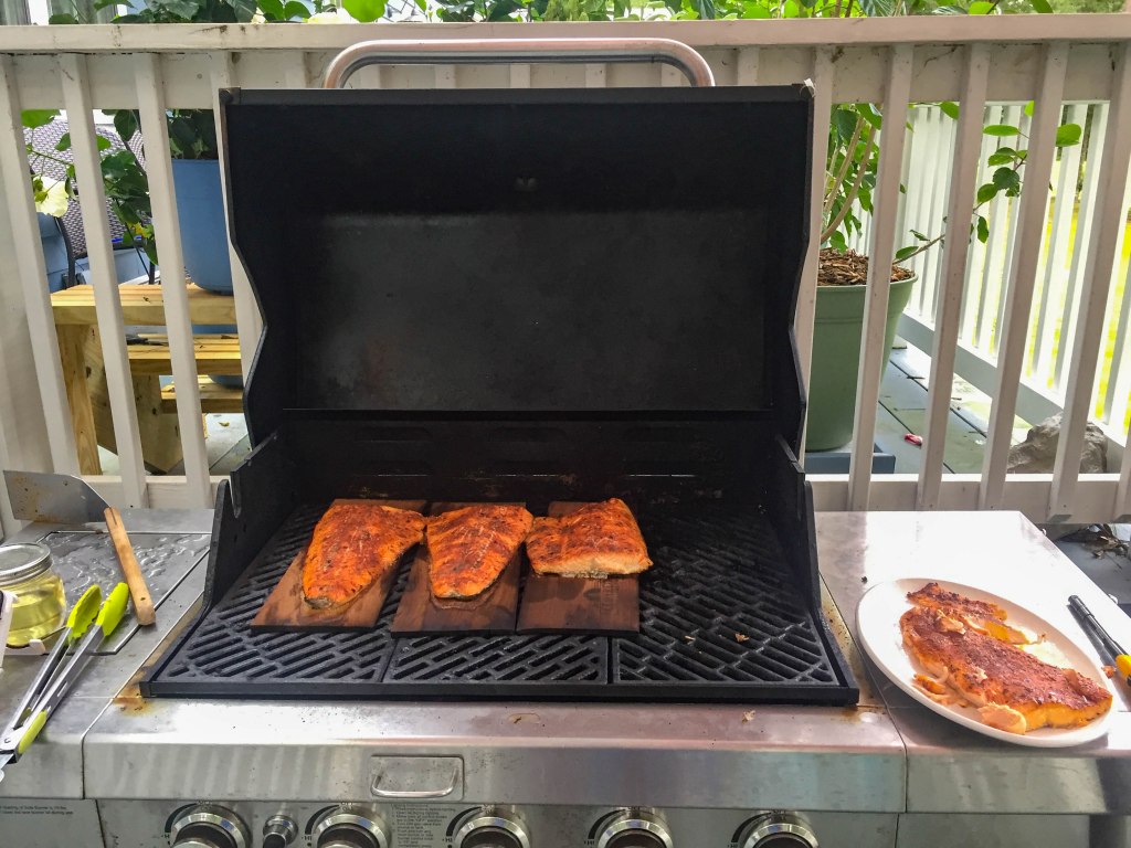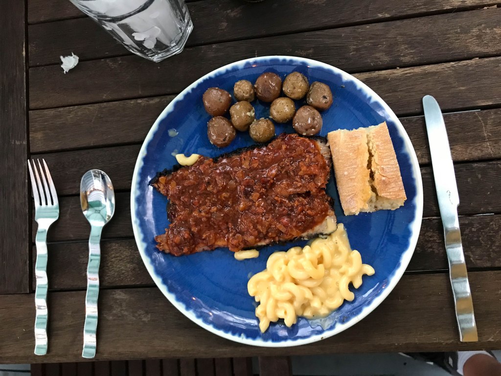 Dad had a rare day off on Sunday so he decided to fix a family dinner – barbecue brisket, Mac n cheese and new potatoes. It was a late dinner for us because we waited for Alex to get home for work around 6:30pm. The weather was cloudy but very nice so we decided to eat out on the deck.