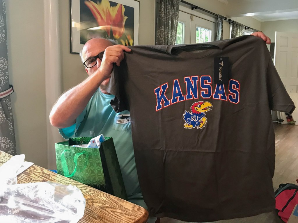 So Father’s Day this year was also the last day of Dad’s vacation and the last thing he wanted to do was cook. Instead we used a gift card to Buffalo Wild Wings and everyone got a hamburger, except of course Mom who ordered a salad. Alex and Sam were nice enough to go get the carryout so Dad didn’t even have to leave the house. Speaking of Alex and Sam, they continue to amaze us with their thoughtfulness when choosing cards for special occasions and writing just the perfect comment on the card… and the handwriting is amazing too. 😄😄😄 See photos below. For Father’s Day, Dad got a new pair of athletic shoes for work, a KU t-shirt and some KU face masks. Unfortunately the masks seem have to shrunk way too much and are now too small for his big head – it kind of looks like he is wearing a very small bikini top over his mouth.