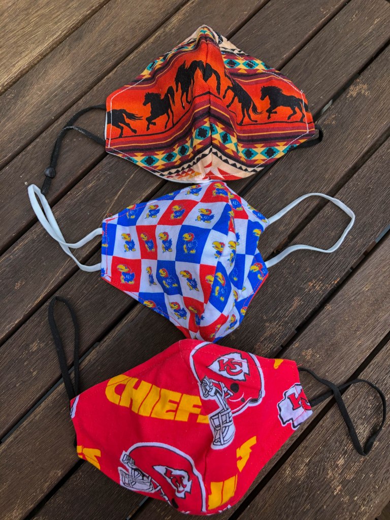 Well the defending World Champions, Kansas City Chiefs are 2-0 to start the season and we are pretty sure the reason why is that Dad has been sporting this nifty face mask on Game Days. Hopefully this proves to be true again this week, because it will probably be a pretty tough game against the Baltimore Ravens. Dad hasn’t tried this theory out yet with the Jayhawks, but we think it might just be safer to wait until basketball season begins anyway. 😃