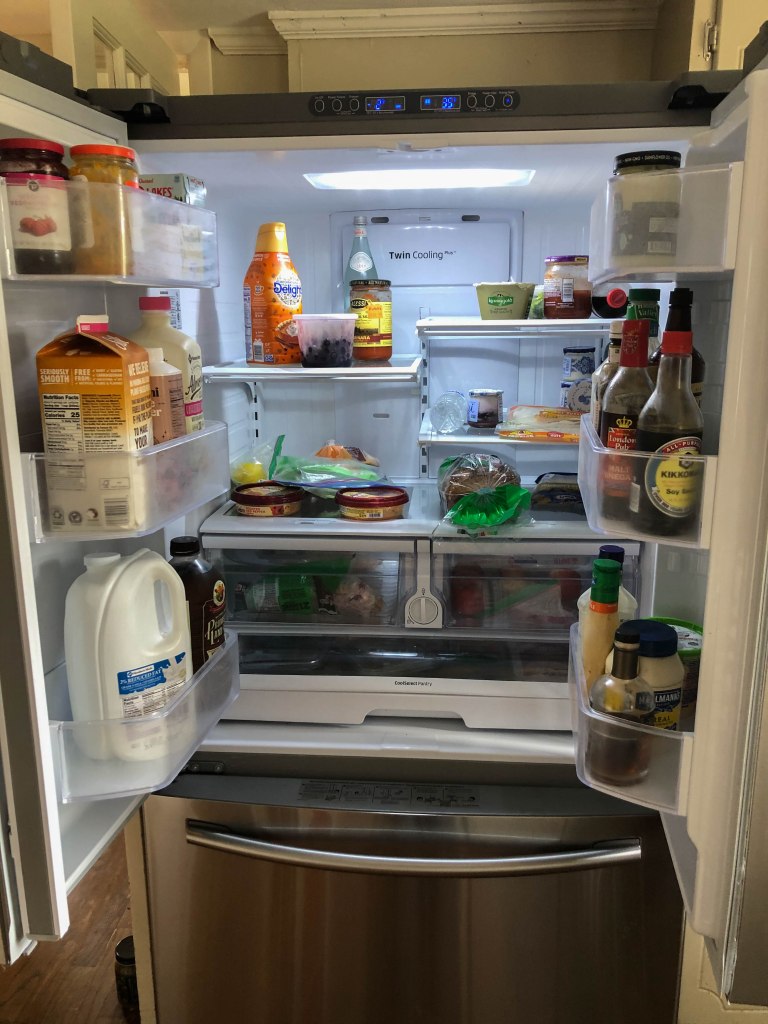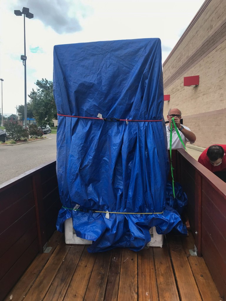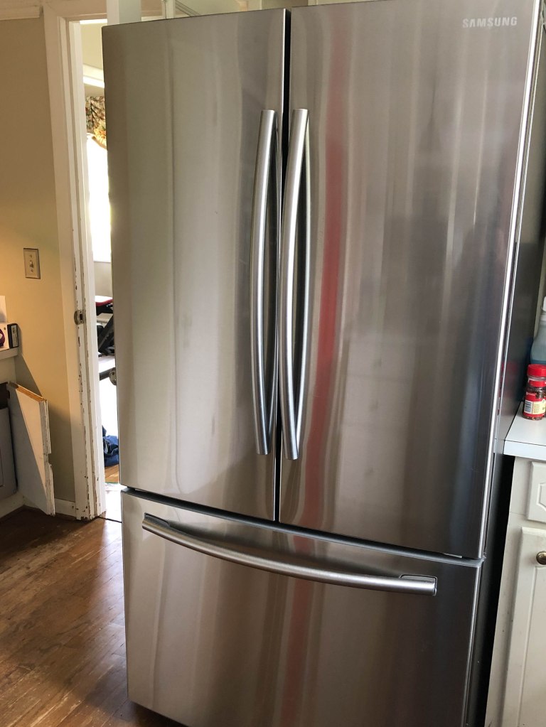 So sometime around the 1st of August our trusty 10-15 year old refrigerator stopped cooling and was leaking around the ice maker. So we started looking for a new refrigerator at Best Buy but pretty much everything was 6-8 weeks out due to the pandemic… even Dad couldn’t get one and he works there 😄. We did finally find one that was only 3 weeks out so we went ahead and ordered it. Meanwhile we investigated the issue and thought that the ice build up in the freezer from the leaking water was keeping the door from closing properly, thus heating up the whole unit…. maybe this was a simple fix so we turned off the ice maker as we could always make ice the old fashioned way. After a couple of days of this fix we decided to cancel the order thinking everything was now OK. Well… this is 2020 so everything wasn’t OK. About 2-3 days before the original order would have been delivered, old Bessie gave up her compressor for good. Luckily and just by chance the Fayetville, NC store had one available the following day – don’t know how or why but we ordered it. The only catch was that we had to drive 4-5 hours roundtrip to pick it up… it was either that or wait about 4-6 weeks for a new one to be delivered. We, of course, decided to make the roundtrip. Keep in mind that it was right after the remnants of one of the hurricanes and it was really, really, really windy outside. Just so you know, driving in windy conditions and towing a large refrigerator in a trailer is no fun at all… longest trip ever. We finally got home and found the refrigerator wouldn’t fit in the kitchen without taking off the doors to the in-wall oven 😓 which was no easy task (it should have been but it wasn’t) and we are pretty sure that there were several 4 and some 7 letter words flying that afternoon. After what seemed like hours, we did finally get it in the kitchen and the doors back on the oven (even cleaned them up real nice).