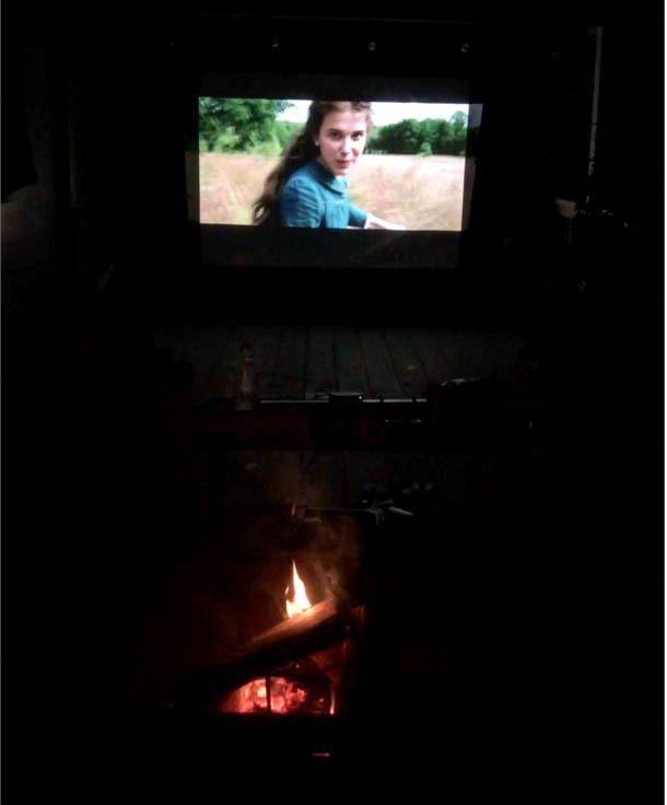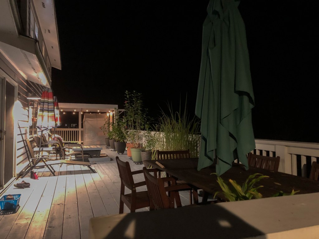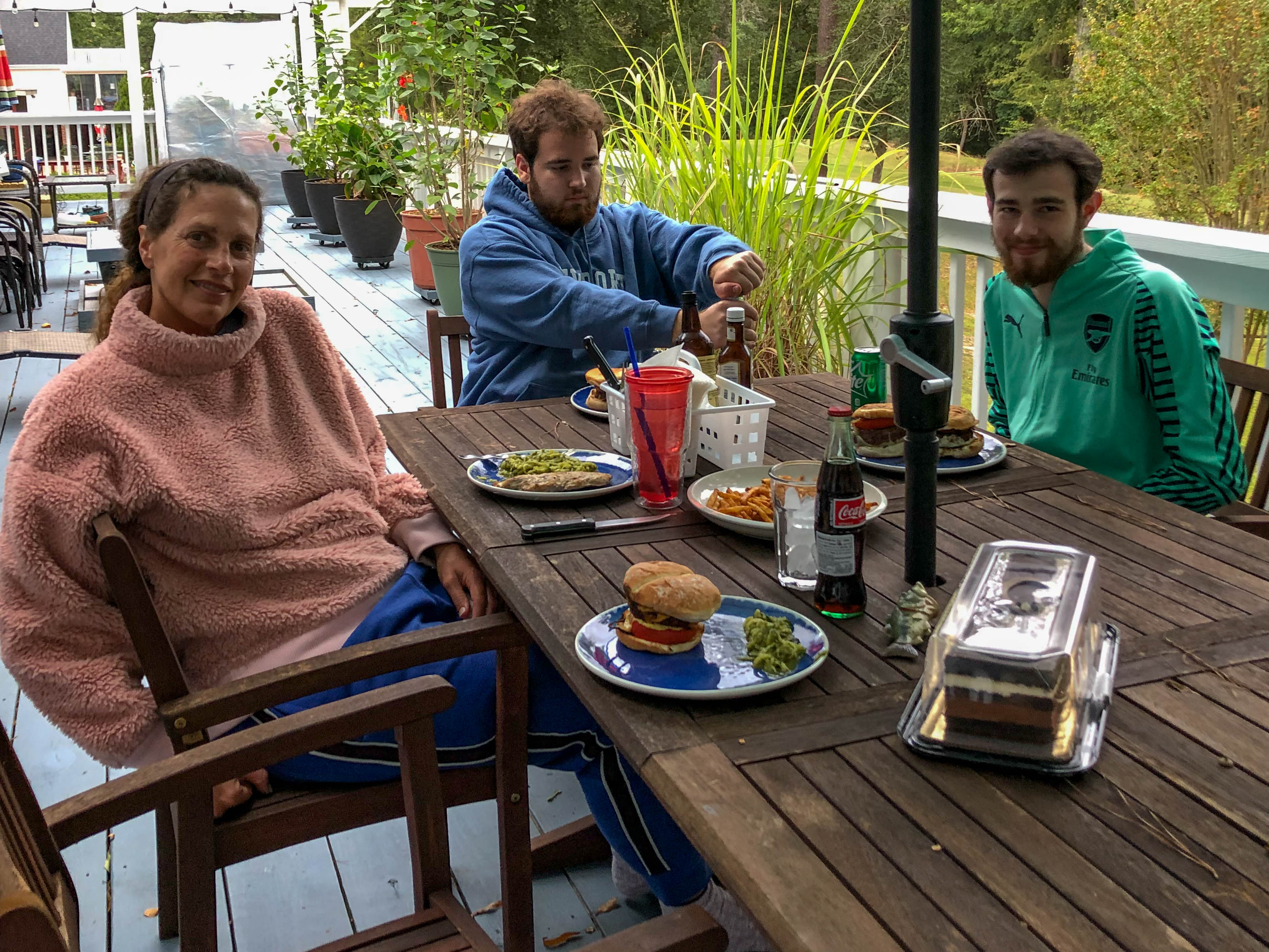 After a long day doing some work from home and then installing a new garbage disposer, Dad decided it would be a great night to watch a movie. Dinner was hamburgers on the grill for Dad and the boys, while Mom had some unusual pesto zucchini with grilled chicken. After dinner we watched the new Enola Holmes movie on Netflix out on the deck. Since it was a little chilly last night, at least by North Carolina standards, we made good use of the fire pit too. Of course not everything went off without a hitch, Dad thought he had all the gear he needed, but in fact he had to make several trips to the basement to find the right cables. So the movie didn’t actually start until around 8:30pm, which is almost our bed time. Then just when everything was almost ready, he spills the nacho cheese all over the deck.