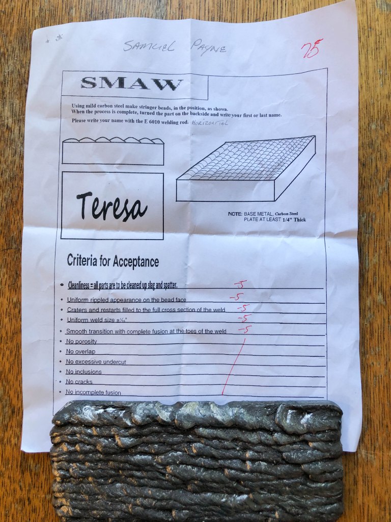 Well it’s not great but it’s not bad either. Sam scored a 75 on his first project in Welding class. Sam did say there were other students in the 80’s and a couple in the 90s, but considering he mostly avoids any tools at home like they are the corona virus this is a pretty good start. 😃 Overall Sam has an A so far in Welding class and he has a B in his math class, with an A in English.