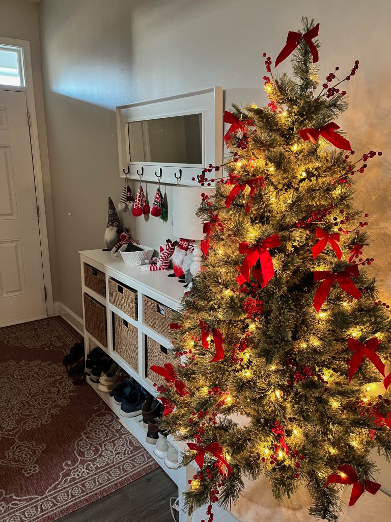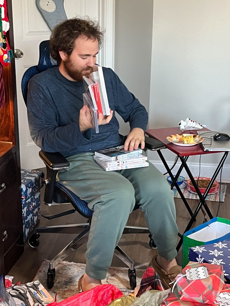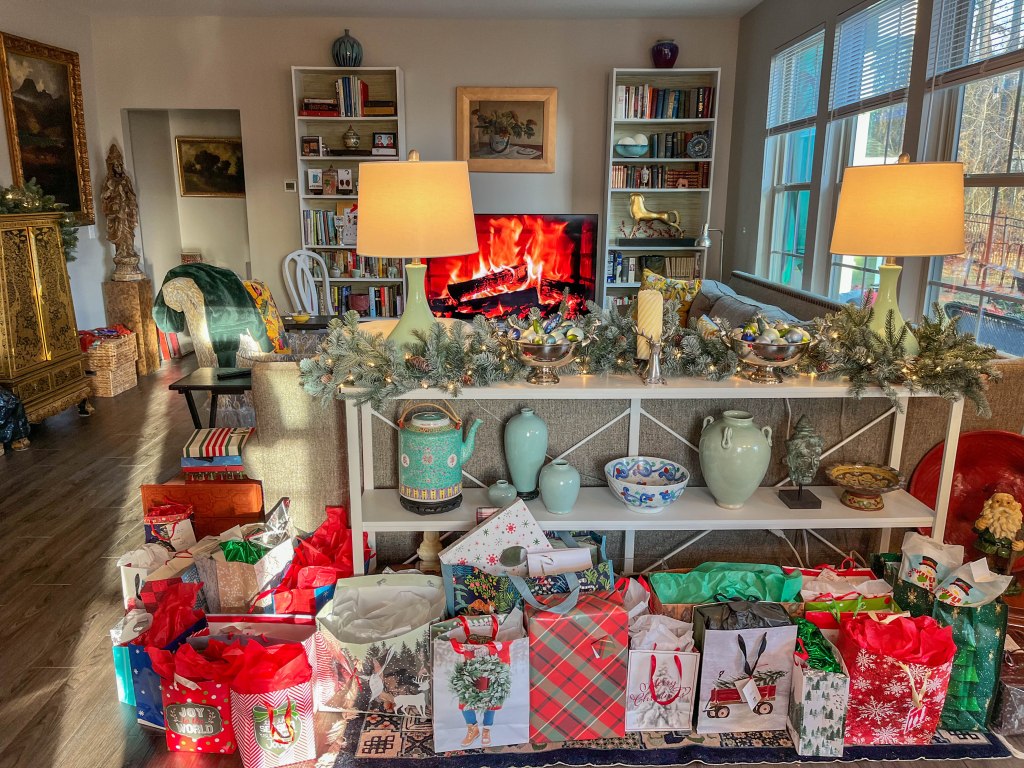 Well, the big day finally arrived and it didn’t disappoint as everyone had a great time. We started with our now customary Feast of the Seven Fishes on Christmas Eve (New England Clam Chowder, grilled salmon, boiled shrimp and roasted vegetables). Then, Christmas morning, we had sausage bites, smoked salmon, country ham biscuits and cinnamon rolls. Of course, the mandatory Mimosas (this year with an added dash of Dranbuie) had us all a little giddy by the time packages were opened. For Christmas dinner, we had a beautiful Pot Roast with all the sides and a few leftovers from the day before. Everyone loved their gifts, but we were so busy opening the presents we forgot to take any photos, except for one of Sam… see caption below. We also included a few photos of the Christmas decorations this year. We hope everyone had a wonderful Christmas and we wish you a very Happy New Year!