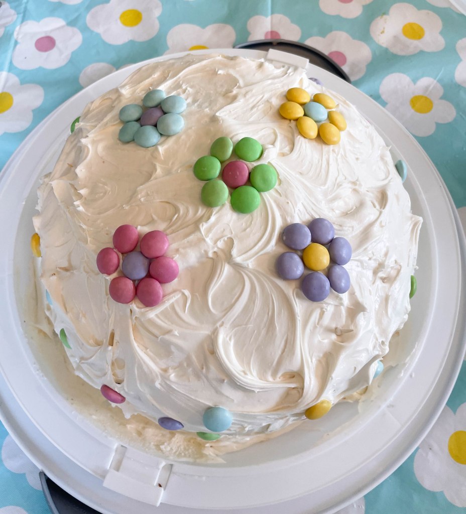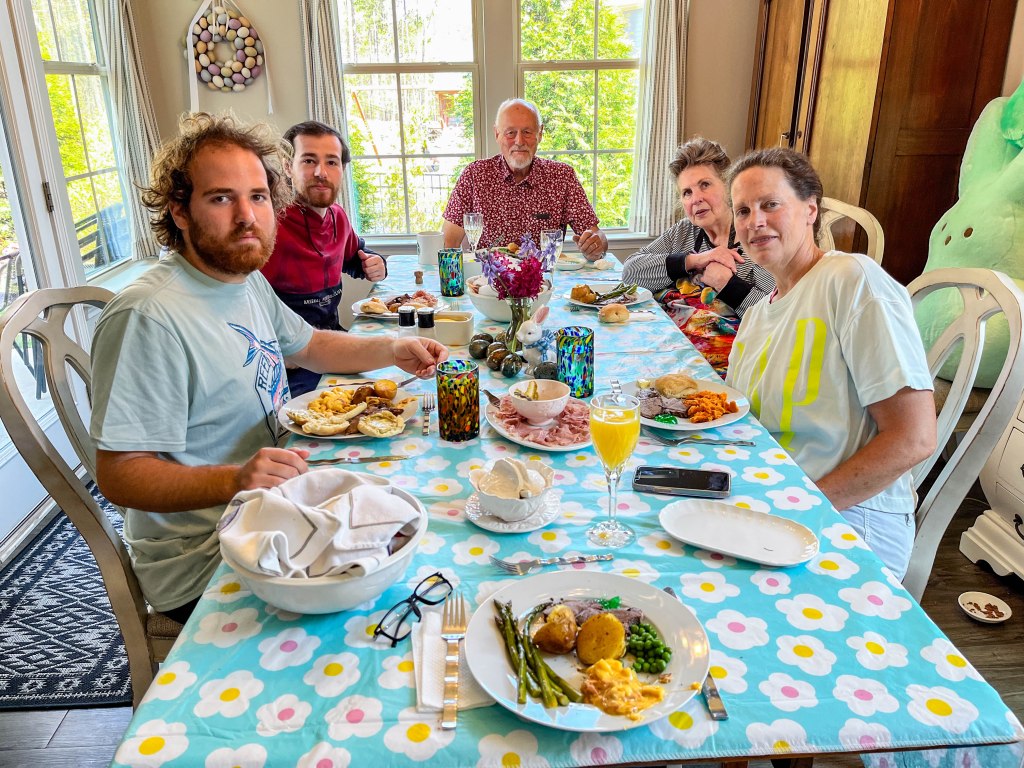 We had a very relaxing Easter Sunday this year 🐰, aside from the cooking and cleaning up 😊. The weather cooperated as well, as it was Sunny and 80° – a little warmer than usual. Even though the boys are much older, they still managed a visit from the Easter Bunny. Sam got a new Shark t-shirt and Alex received a huge tub of Starburst jellybeans (which he will be sharing). Mom also got into the act with a new hose wand. Dinner was roasted leg of lamb w/mint jelly, roasted potatoes, Mac & cheese, asparagus, peas and rolls. Nana also made a very nice easter cake for dessert. We hope everyone else had a lovely Easter and we should have some updated house photos in a few weeks as we are finishing up a few projects.