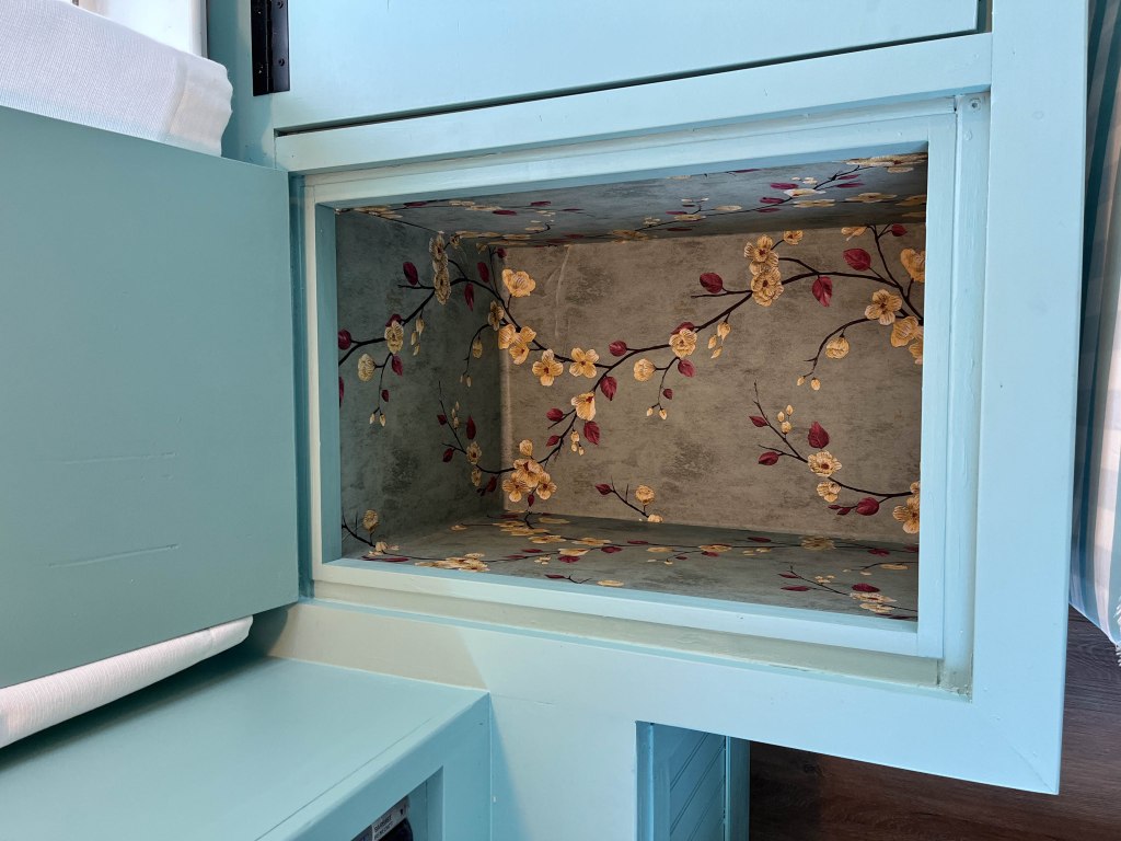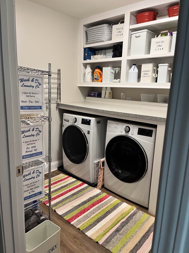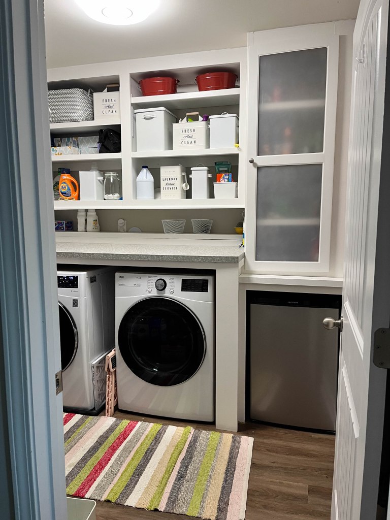 Project 2: Laundry room cabinets are finally finished. When we first moved in this was an empty room, with 2 sets of the wire shelves above the laundry units. We added the cabinets and the counter tops. The last piece was the ‘glass’ door that holds all the drinks (above the small fridge).
