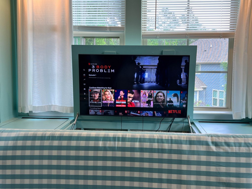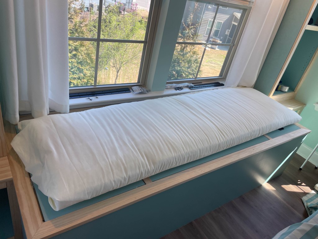 Project 4: Window seat/bookcase in Master bedroom. We had a large area of the bedroom that wasn’t really being utilized, so we added a large window seat with a bookcase and a hidden 43″ TV. The window seat has 2 large compartments for storing extra blankets/junk, with the another large compartment that houses the TV. Since it’s under a set of double windows, it’s actually large enough to completely stretch out and take a nap. Nana, helped on this project as she made the very large cushion for top of the window seat and she altered all the curtains in the room. Finally, we will add some trim molding to the front of the window seat box, but we won’t do that until we work on the wall molding. FYI, the 6th photo is what the room looked like when we originally toured the house.
