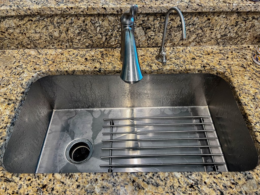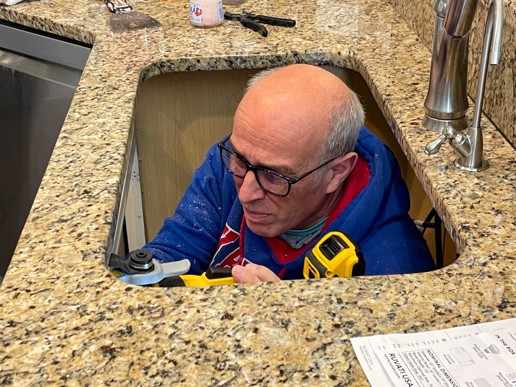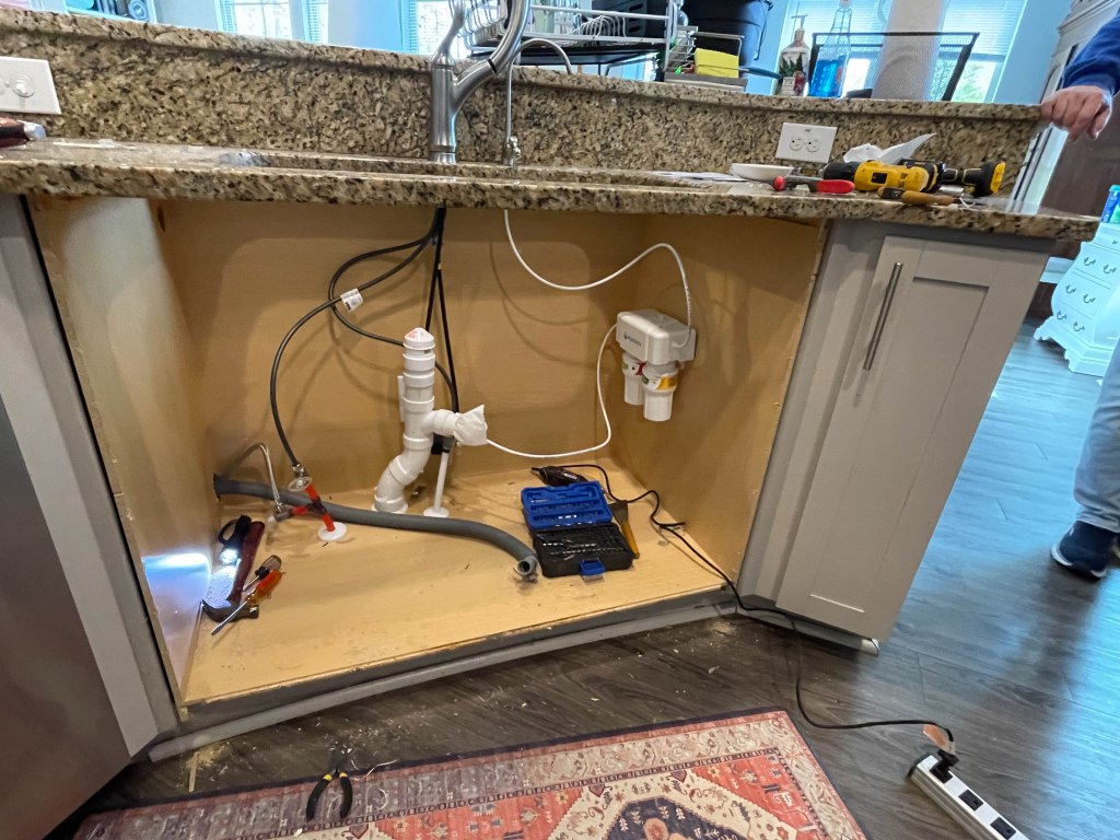 Project 3: Kitchen sink – this was a big project and we needed all hands on deck to finish this one. Because of the design of the island, the sink is a little smaller than normal. In addition, the old sink had a divider in the middle, which made it impossible to get large pots in the sink to clean. We replaced it with a new one which was quite a bit heavier and a huge upgrade to the old unit (also much more quiet!). We added and new faucet and an additional water filter w/spigot while we had everything disassembled.