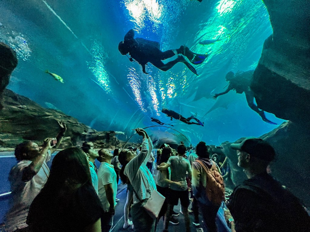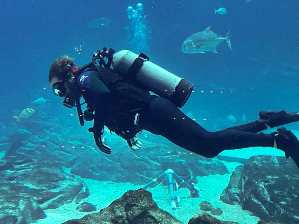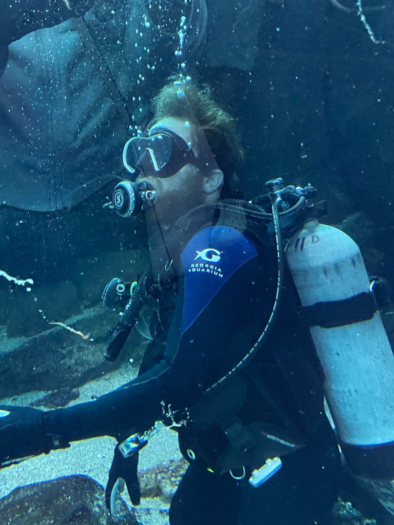 A few years ago, Sam expressed interest in going diving at the Georgia Aquarium (https://www.georgiaaquarium.org) and we were all set to go, but things came up and we couldn’t make it that year. Covid came and we kind of forgot about it after that, but this year we decided that now was a good time. Luckily everyone was willing to chip in for his present since it had gone up quite a bit since the last time we looked… Alex even chipped in and bought him the official dive video.