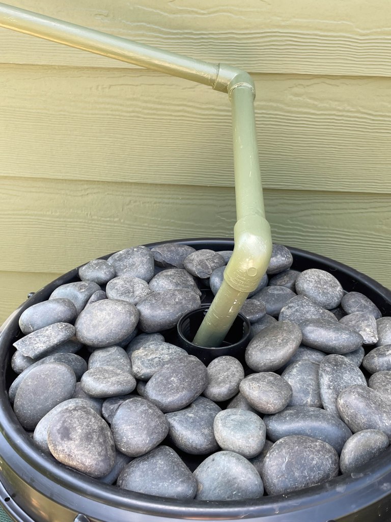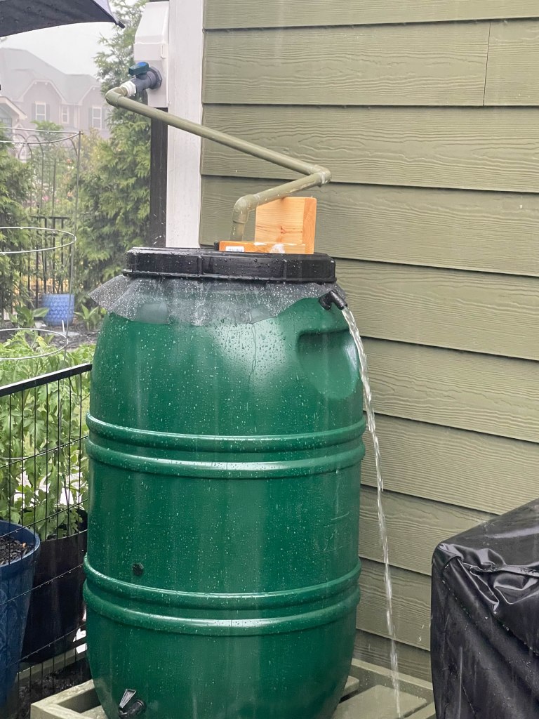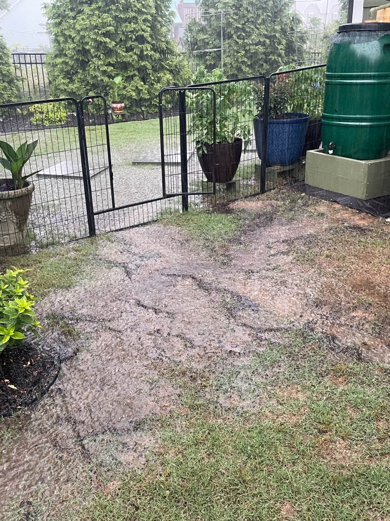 Since the rain barrel didn’t arrive until after Mother’s Day we didn’t get it installed until this last weekend. There was only a 40% chance of rain on Saturday with some possible scattered thunderstorms after 4pm, so Mom was anxious to get it installed. Well, as has been the case a lot lately, the weathermen blew that forecast as it poured for about 3 hours straight and dumped 2″ of rain on us in that time. The rain barrel is 60 gallons and was full within the first hour. Unfortunately we didn’t get a hose attached to the overflow valve so all the remaining water just dumped out the side. We dodged the bullet the rest of Memorial Weekend as most of the rain missed us. This week we hope to dry out and get that overflow hose attached.