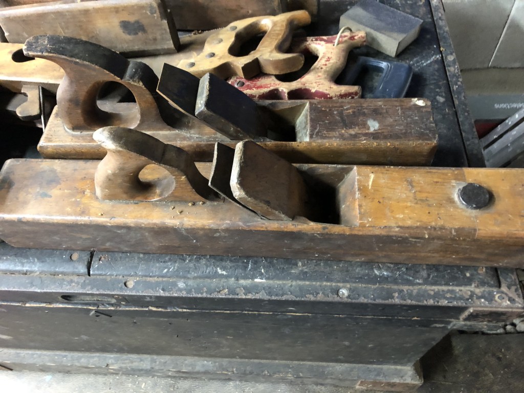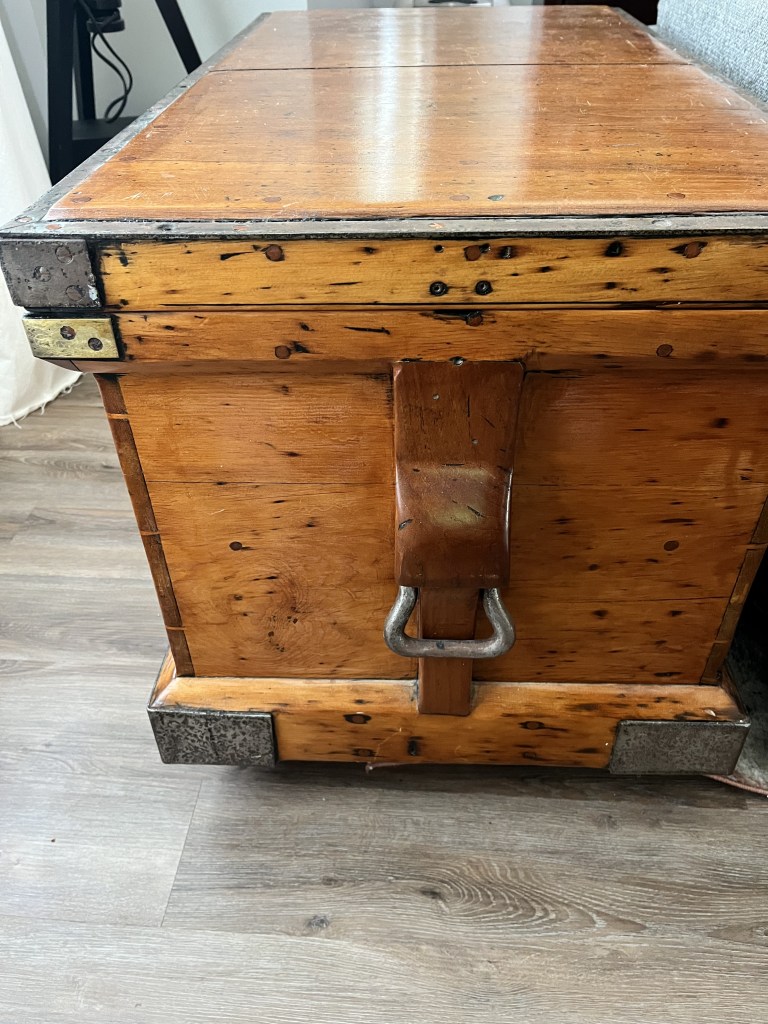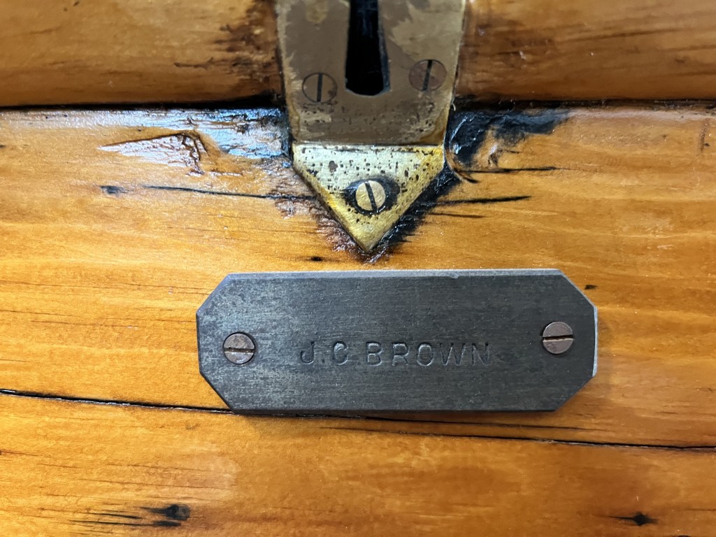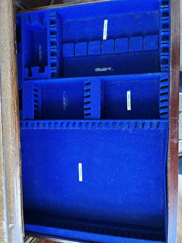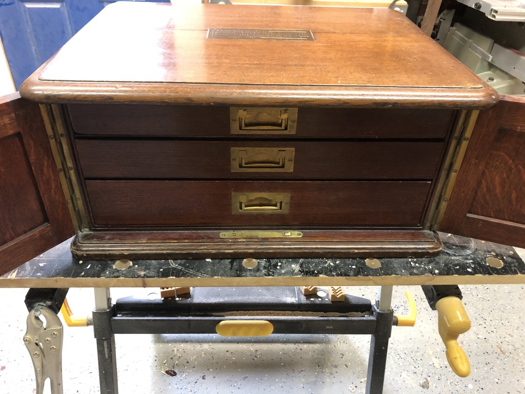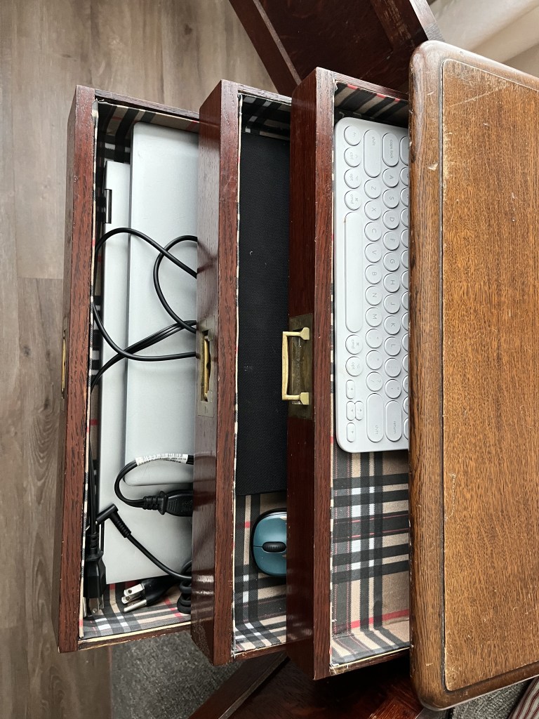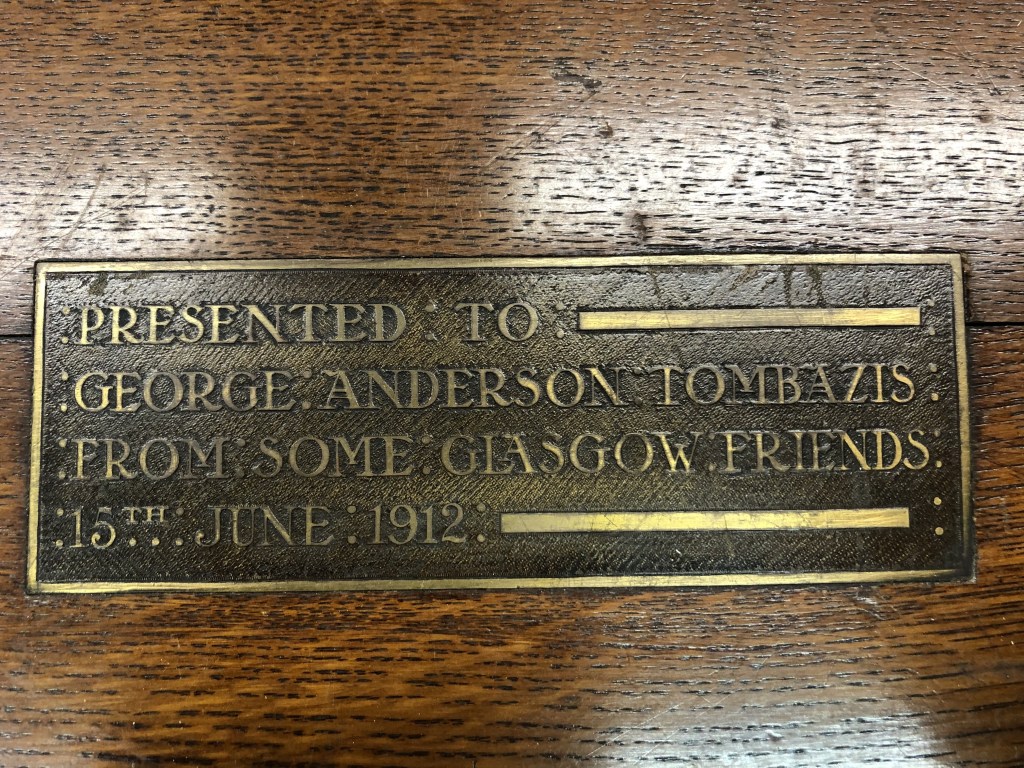 The second item was an antique silverware tray/box that Nana purchased while living in Scotland. Unfortunately, the way it was designed to hold silverware wasn’t very conducive to holding tools so it wasn’t used much and stayed in the basement until we moved to Clayton. Dad finally got around to removing the dividers and flocking (spray on felt material) a couple of weeks ago and it has now become a very functional place to store tablets and laptops. Dad lined the interior with some chipboard covered in a cotton ‘Tartan’ style fabric in deference to it’s heritage. The silverware box has an engraved label on the top dated June 15th 1912 as it was apparently a gift of some importance. After doing a little online research, Dad found out that the gentleman that received the silverware box was a Spirit Merchant and a Consul for Greece who lived and died in Glasow, Scotland and is actually listed in the Glascow Necropolis (cemetery) walking tour (https://www.glasgownecropolis.org/).