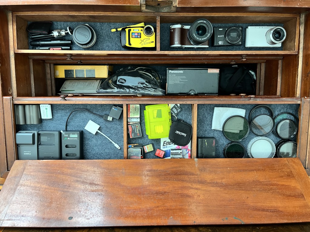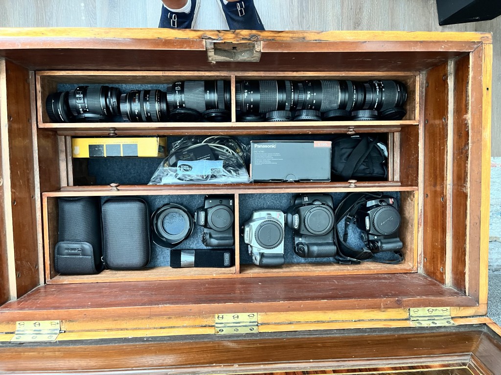 The first one was a very large and heavy tool trunk that was David’s grandfathers’. His Grandfather built the trunk when he was an apprentice carpenter for the railroad (building/repairing passenger coaches) and this was his final project before he graduated to a full-fledged carpenter. The trunk even came with quite a few antique planes that he had used on the job (Dad used one of the planes to help build the kitchen table). The inside of the trunk was very intricate with a bunch of compartments for various tools. Since it was so big and heavy, it didn’t get moved much and it wasn’t very practical for every day tools. So after thinking about it for a while, Dad decided that maybe it should hold a different set of tools… something that he had a lot of and no place to store safely – his camera collection. The inside of the trunk was in good shape, although a little dirty, but the outside had a heavy duty black paint on the outside to protect it from all the elements… presumably something that was required back then when moving from one job site to another. Dad knew that Mom was not going to let that sit in the house, so he decided to refinish it and put some wheels on the bottom to easily maneuver. The refinishing took much longer than anticipated but was definitely worth it and it became a nice table for the Den. Although he stored all of his old camera gear in there, Dad never finished the inside, that is until a couple of weeks ago. It still needed a good cleaning and he also inserted some foam boards with grey felt into the compartments to help protect the cameras. He also re-organized all the cameras and lenses to make sense with the most used ones in the top compartments.